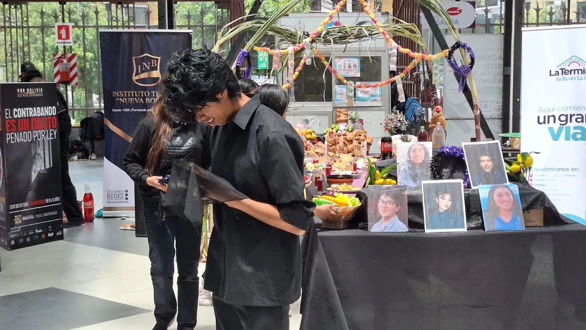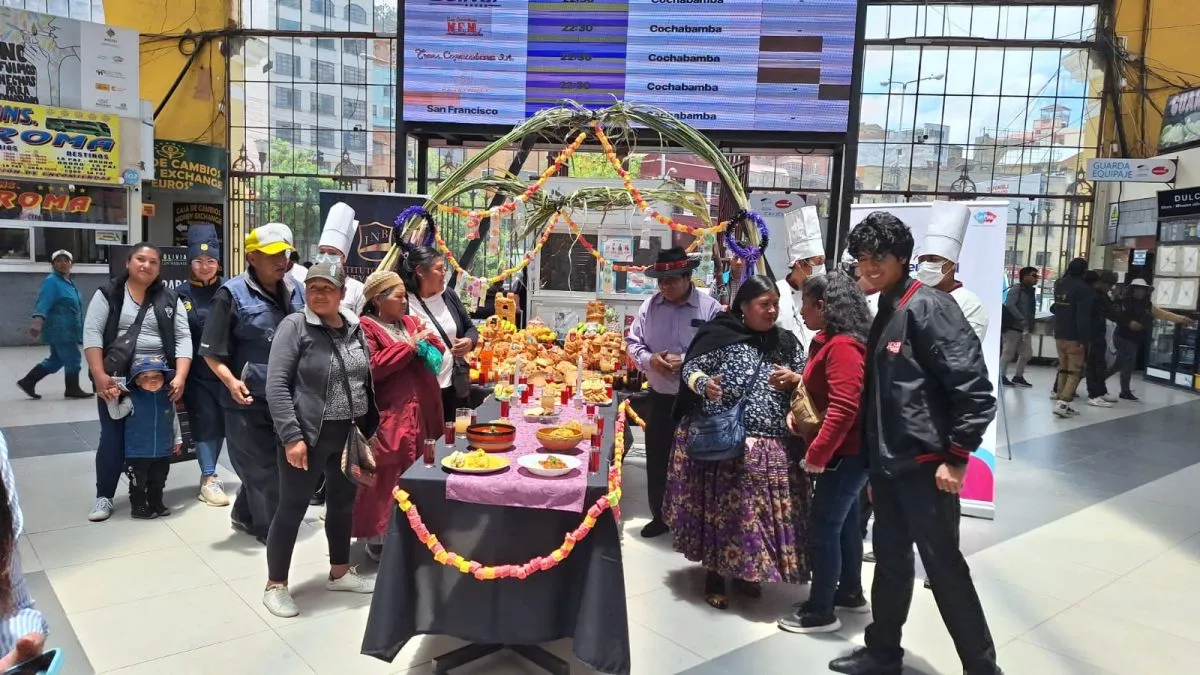 La Terminal de Buses de La Paz instaló una mesa para los difuntos en sus dependencias, la cual fue armada por los trabajadores y comerciantes que día a día se encuentran en este recinto. Como marca la tradición, en esta jornada a mediodía se realizó el recibimiento de las almas con música, teatro y comida. Se trató de una actividad en la que participaron también un ballet y un instituto de estudios gastronómicos.