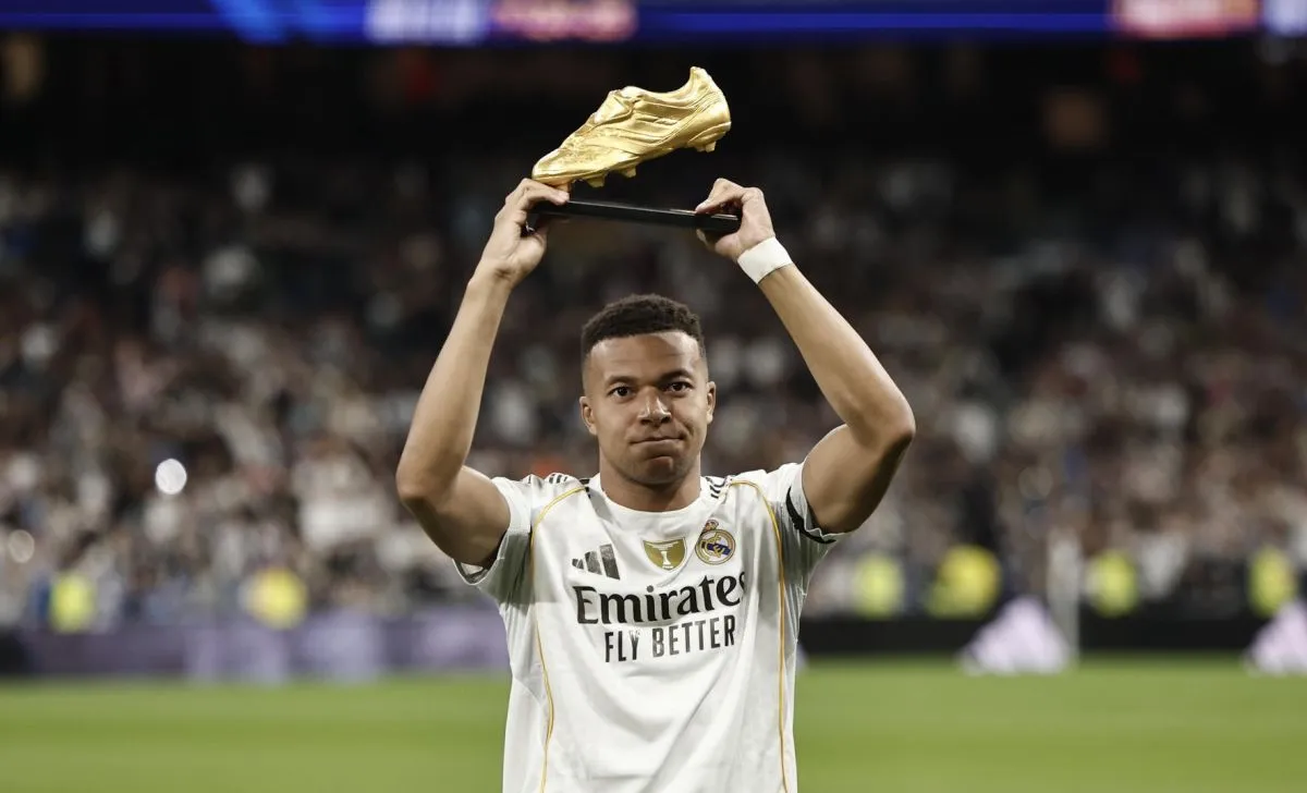El delantero francés Kylian Mbappé sostiene y presenta a los hinchas del Madrid  la Bota de Oro. Foto: EFE