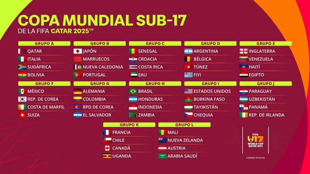 Grupo A: Qatar, Italia, Sudáfrica y Bolivia; Grupo B: Japón, Marruecos, Nueva Caledonia y Portugal; Grupo C: Senegal, Croacia, Costa Rica y Emiratos Árabes Unidos; Grupo D: Argentina, Bélgica, Túnez y Fiji; Grupo E: Inglaterra, Venezuela, Haití y Egipto; Grupo F: México, Corea del Sur, Costa de Marfil y Suiza; Grupo G: Alemania, Colombia, Corea del Norte y El Salvador; Grupo H: Brasil, Honduras, Indonesia y Zambia; Grupo I: Estados Unidos, Burkina Faso, Tayikistán y República Checa; Grupo J: Paraguay, Uzbekistán, Panamá e Irlanda; Grupo K: Francia, Chile, Canadá y Uganda, y Grupo L: Mali, Nueva Zelanda, Austria y Arabia Saudita.