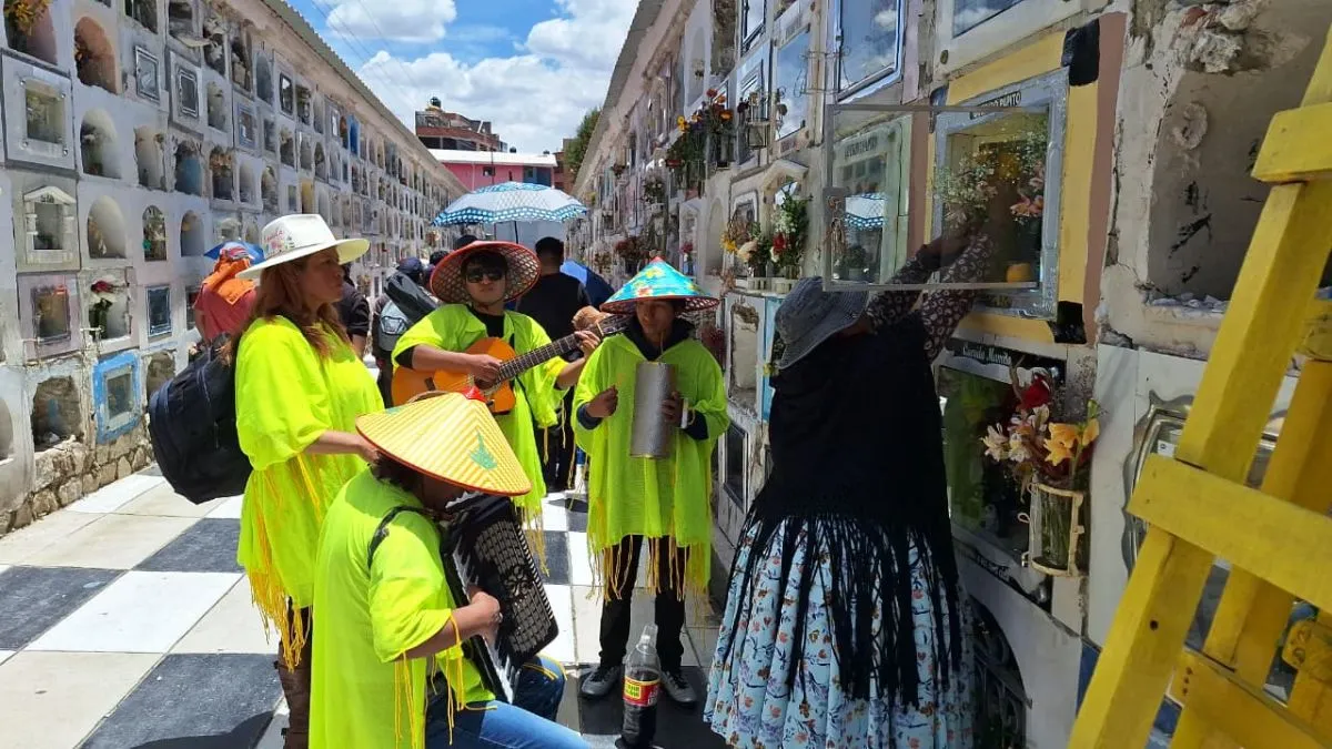 Una banda folklórica acompaña a una persona en la tumba de su familiar. Foto: Visión 360
