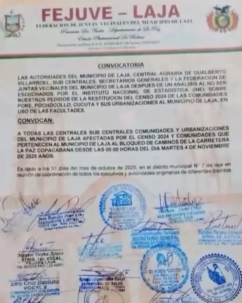 La convocatoria al bloqueo de la Fejuve señala: “Las autoridades del municipio de laja, Central Agraria de Gualberto Villarroel, sub centrales, secretarios generales y la federación de juntas vecinales del municipio de Laja después de un análisis al no ser escuchados por el INE sobre nuestros pedidos de la restitución del censo 2024 de las comunidades Poke, Pochocollo, Cucuta y sus urbanizaciones al municipio de Laja, en uso de las facultades, convocan a todas las centrales sub centrales comunidades y urbanizaciones del municipio de Laja afectadas por el censo 2024 y comunidades que pertenecen al municipio de laja al bloqueo de caminos de la carretera La Paz-Copacabana desde las 00.00 horas del día martes 4 de noviembre de 2025 años”.
