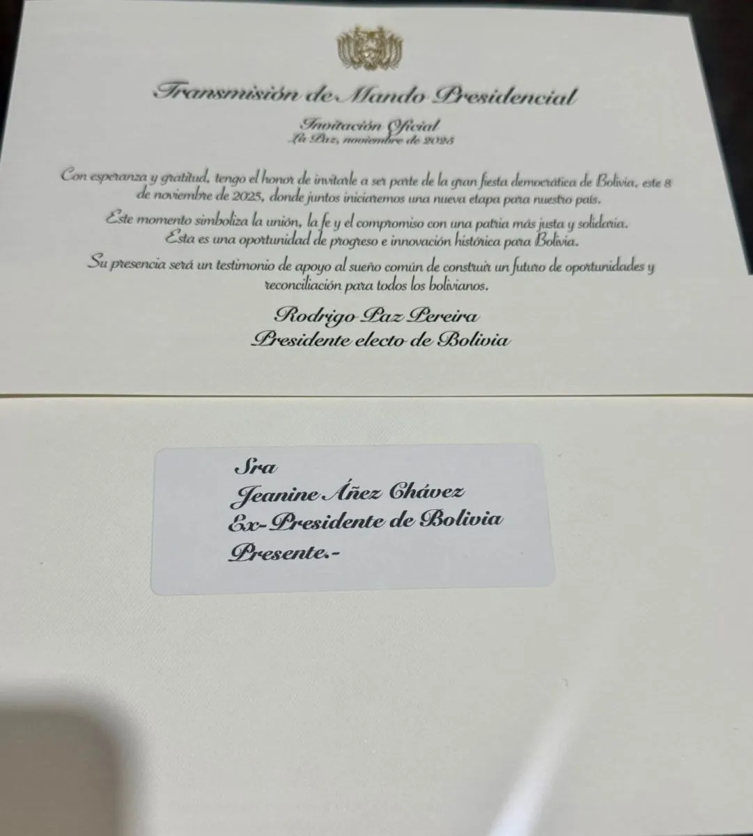 En redes sociales, circuló una imagen de la transmisión del mando presidencial que le extendió Paz a la exmandataria: “Con esperanza y gratitud, tengo el honor de invitarle a ser parte de la gran fiesta democrática de Bolivia, este 8 de noviembre de 2025, donde juntos iniciaremos una nueva etapa para nuestro país”, dice la tarjeta.