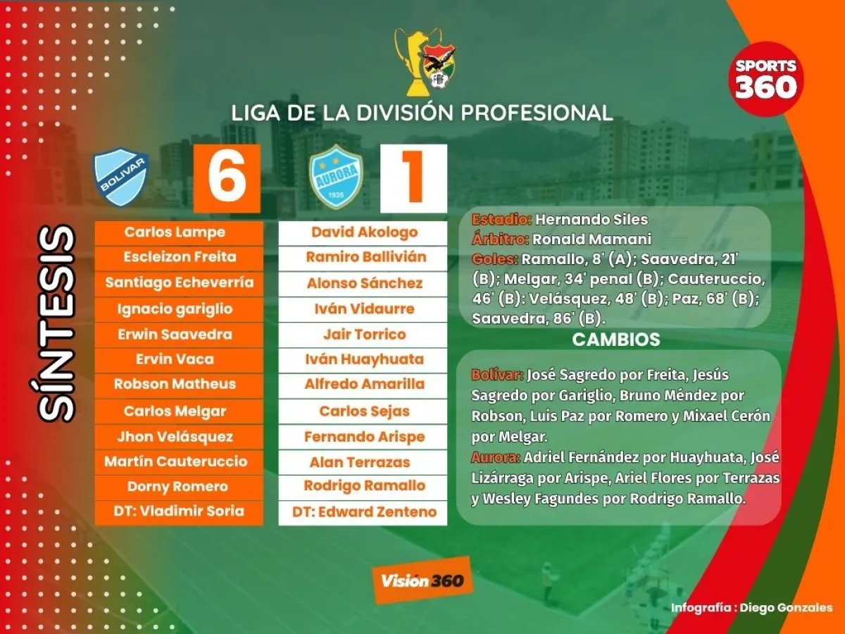 Bolívar goleó a Aurora (6-1) en el partido reprogramado de la fecha 22 que se jugó en la noche de este martes en el estadio Hernando Siles, quedó a seis puntos del líder Always Ready y a tres de The Strongest, el segundo clasificado, a falta de seis jornadas para la finalización de la Copa de la División profesional.