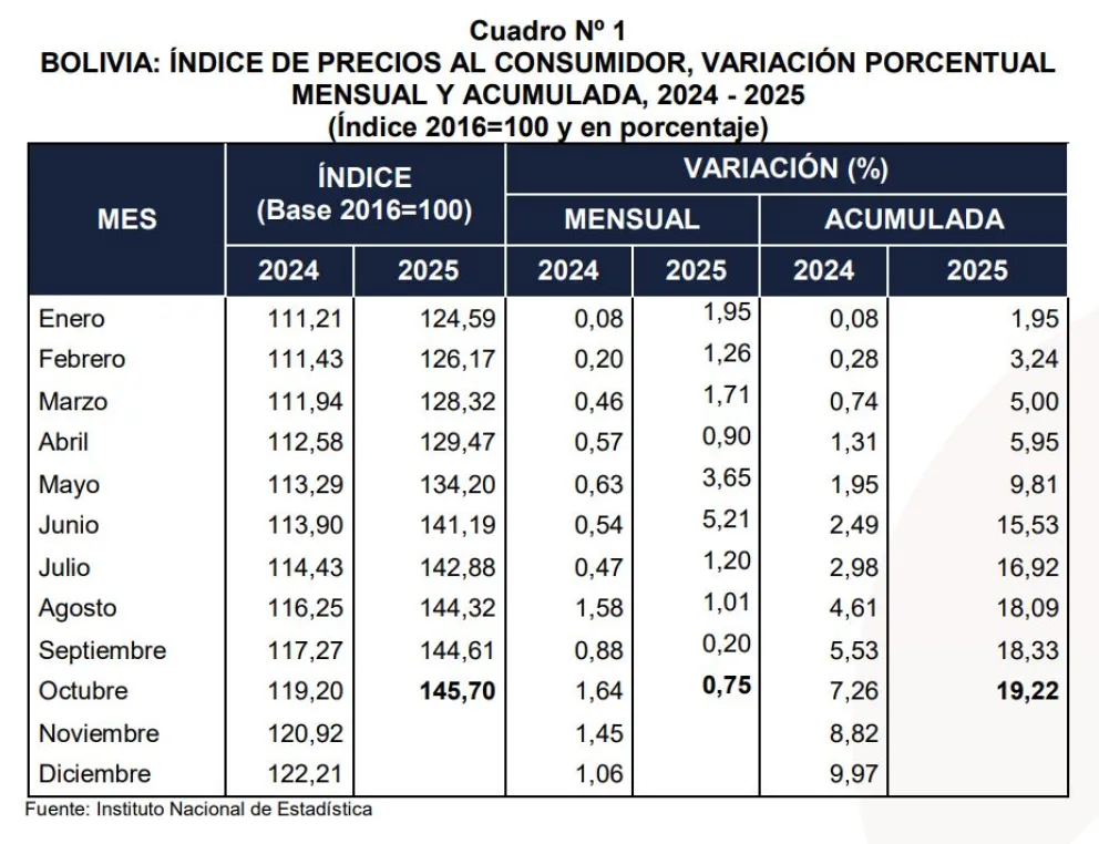 Según el informe publicado en su página oficial, "la variación mensual del Índice de Precios al Consumidor (IPC) de octubre fue positiva en 0,75% respecto a septiembre. La variación acumulada hasta octubre alcanzó 19,22%".