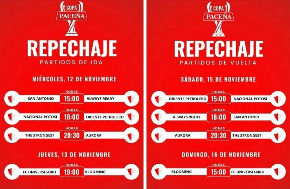 La Dirección de Competiciones de la Federación Boliviana de Fútbol (FBF) dio a conocer este lunes el cronograma de los duelos de ida y vuelta que sellarán el pase de los últimos equipos a cuartos de final.