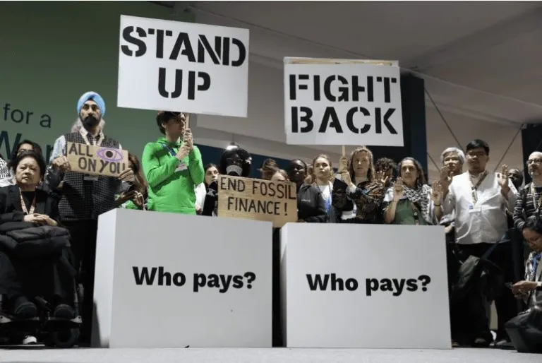 La sociedad civil protestó en contra de los combustibles fósiles y exigió un incremento en el financiamiento climático en la COP29 de 2024. Foto: cortesía Kiara Worth / UN Climate Change