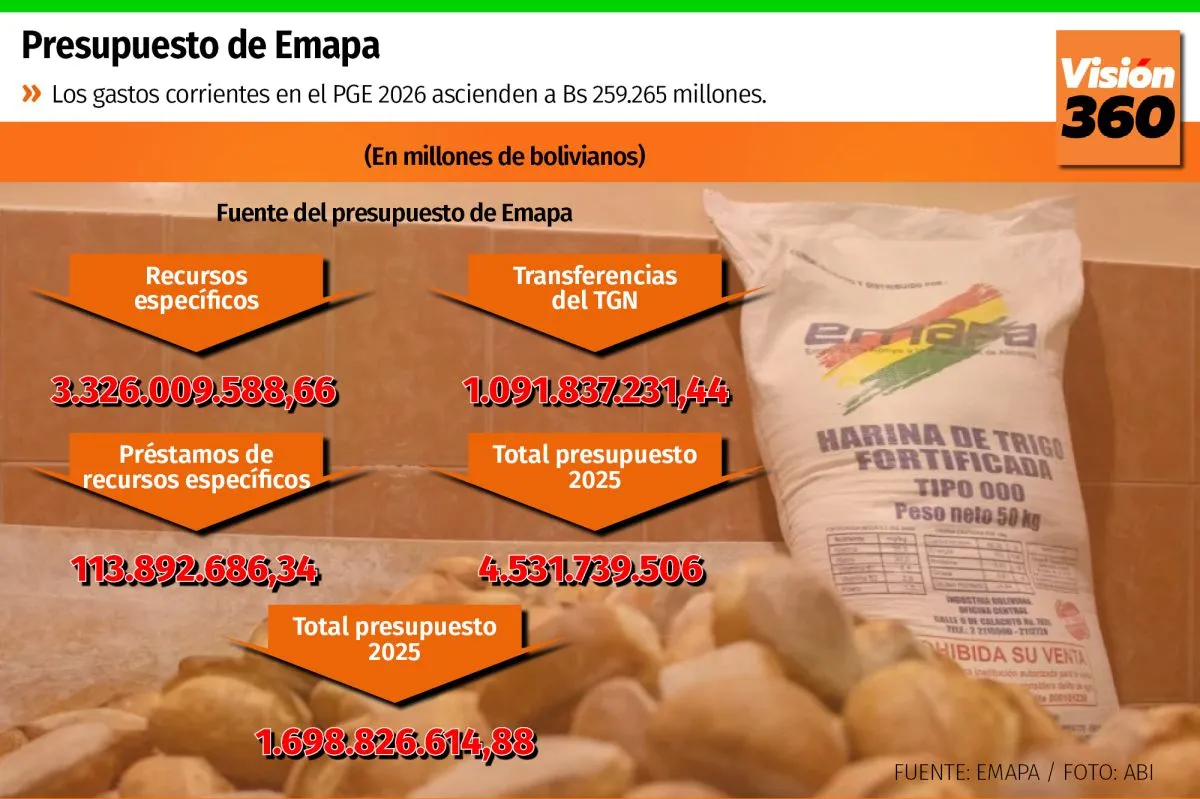 La Empresa de Apoyo a la Producción de Alimentos (Emapa), bajo sospecha de corrupción, este año maneja un presupuesto de 4.531,7 millones de bolivianos. De ese total, 1.091,8 millones de bolivianos son transferencias que le realiza el Tesoro General de la Nación (TGN).