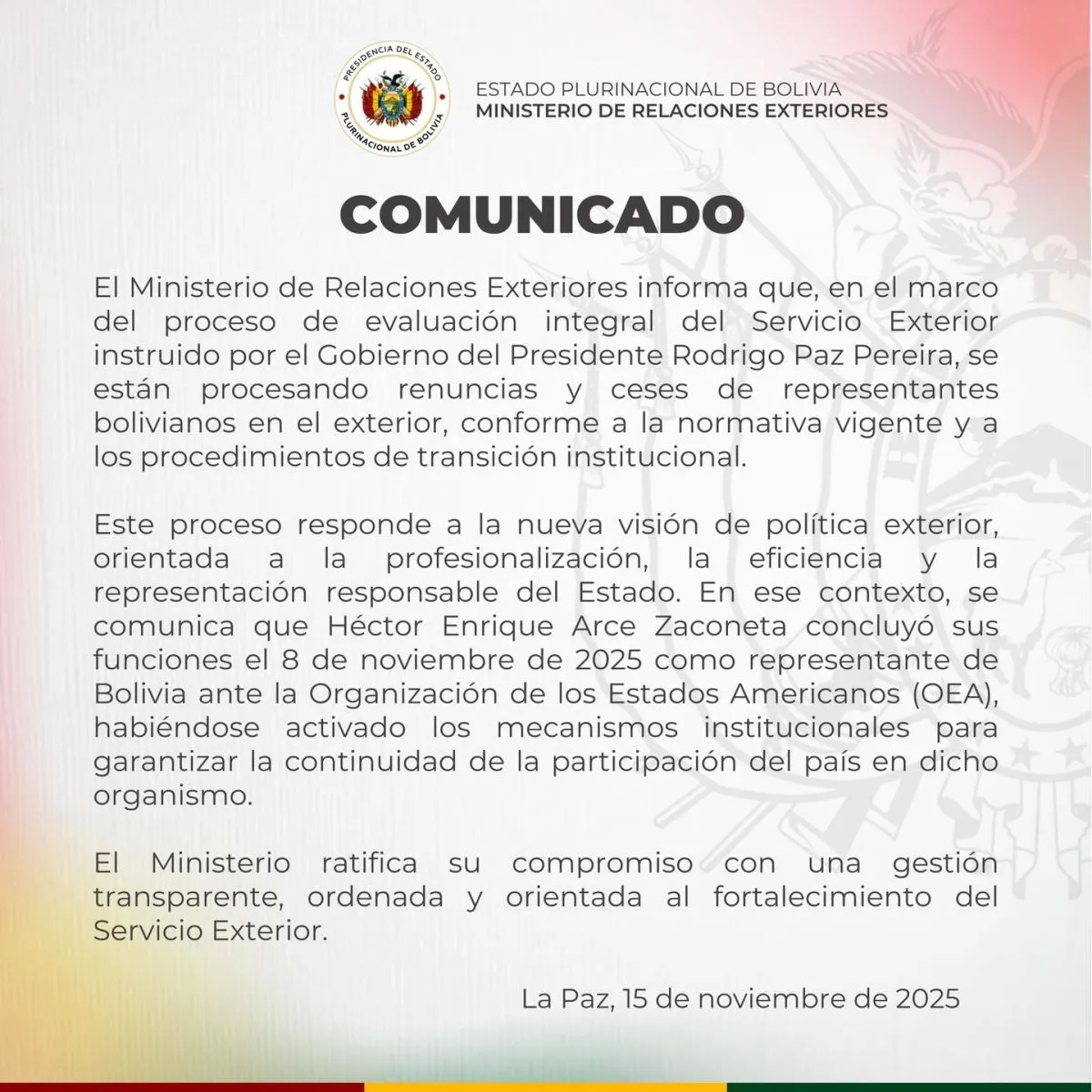 “Se comunica que Héctor Enrique Arce Zaconeta concluyó sus funciones el 8 de noviembre de 2025 como representante de la Organización de los Estados Americanos (OEA), como parte del proceso a la nueva visión de política exterior, orientada a la profesionalización, la eficiencia y la representación responsable del Estado”, se lee en el comunicado, publicado este domingo en la página en Facebook de la Cancillería.