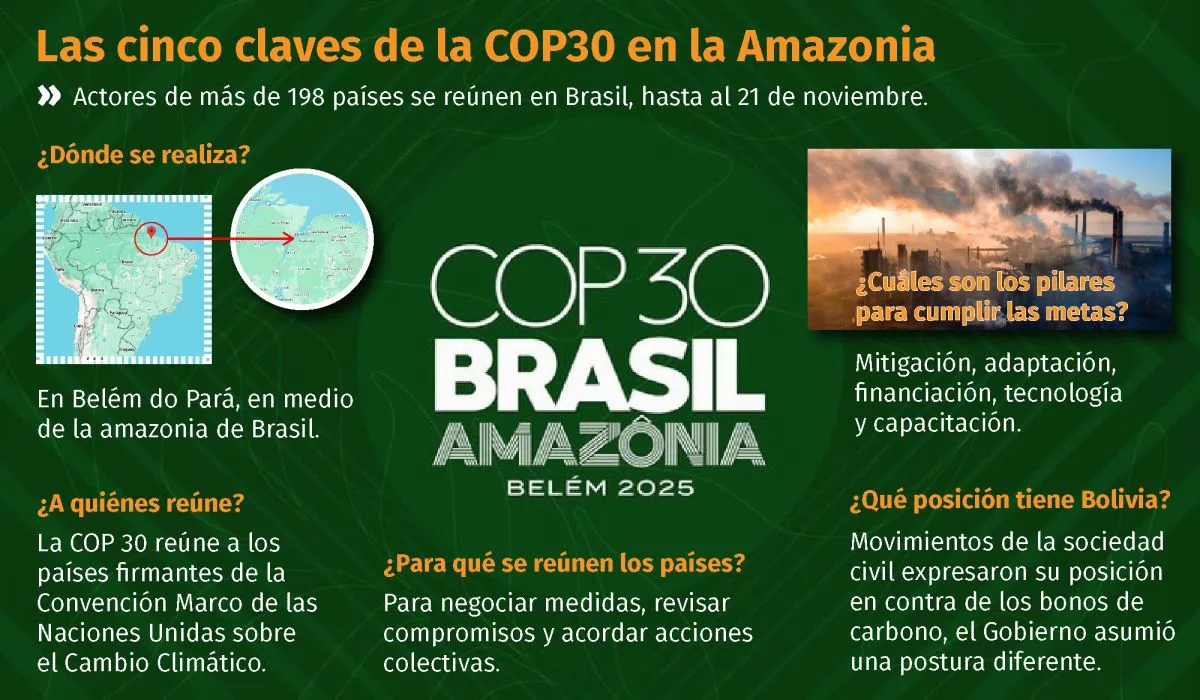 Belém do Pará, en medio de la Amazonia brasileña, fue elegida como el punto de encuentro para que actores de 198 países decidan las acciones para enfrentar la crisis climática. Allí, desde el 10 al 21 de noviembre, se desarrolla la COP30, o la Conferencia de las Partes de la Convención Marco de las Naciones Unidas sobre el Cambio Climático. Un encuentro en el que el gobierno boliviano y representantes de la sociedad civil están presentes.