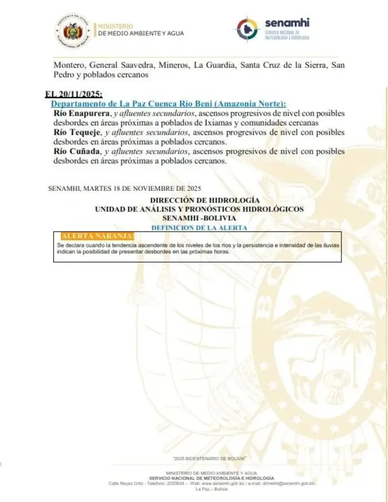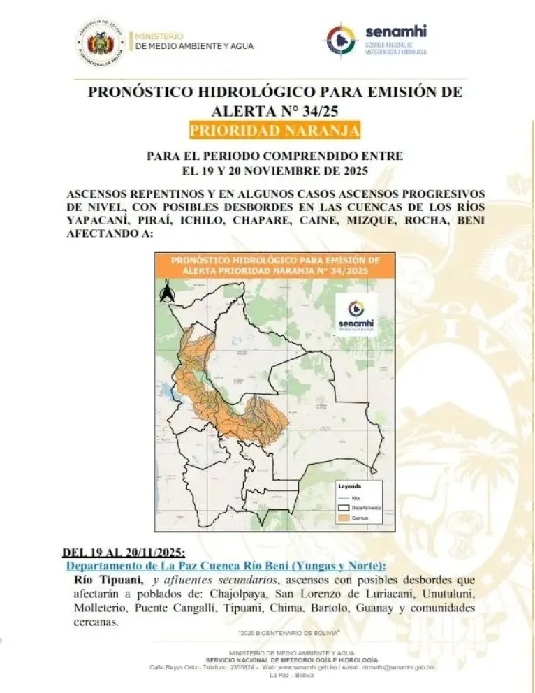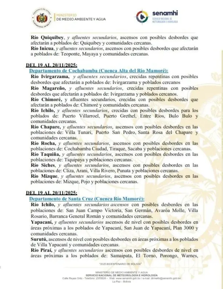 La alerta se extienden entre el periodo comprendido entre el 19 al 20 de noviembre. Según el informe emitido por el Senamhi los posibles desbordes se producirían en las cuencas de los ríos Yapacaní, Piraí, Ichilo, Chapare, Caine, Mizque, Rocha y Beni.