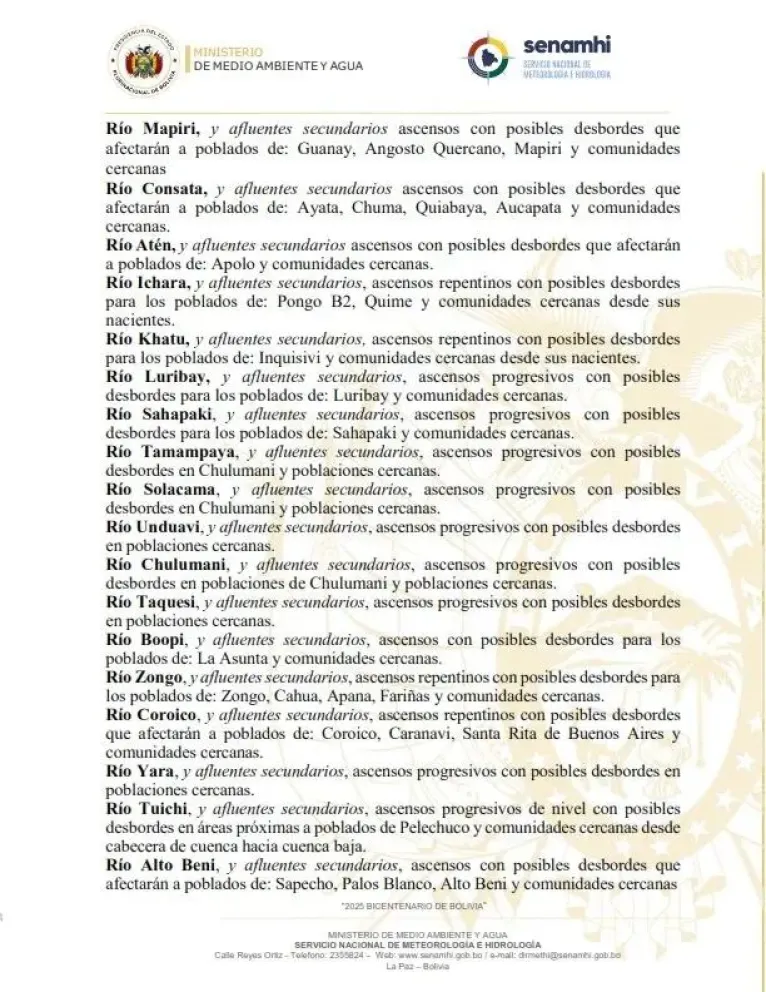 En el departamento de La Paz, en la cuenca Río Beni, los ríos que presentarán ascensos progresivos con posibles desbordes son: Tipuani, Mapiri, Consata, Atén, Ichara, Khatu, Luribay, Sahapaki, Tamampaya, Solacama, Unduavi, Chulumani, Taquesi, Boopi, Zongo, Coroico, Yara, Tuichi y Alto Beni. Afectarán a las poblaciones de Chajolpaya, San Lorenzo de Luriancani, Unutuluni, Molleterio, Puente Cangalli, Tipuani, Chima, Bartolo, Guanay y comunidades cercanas.