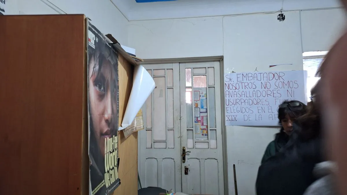 En las paredes destacaban letreros, “Sr. Embajador, nosotros no somos avasalladores ni usurpadores, fuimos elegidos en el congreso XIX de la APDHB”, rezaba uno de ellos. El letrero se refiere a la elección –impulsada por el entonces gobierno del Movimiento Al Socialismo– de Edgar Salazar como presidente de la institución. En esa ocasión, se creó una directiva paralela que expulsó a Carvajal.
