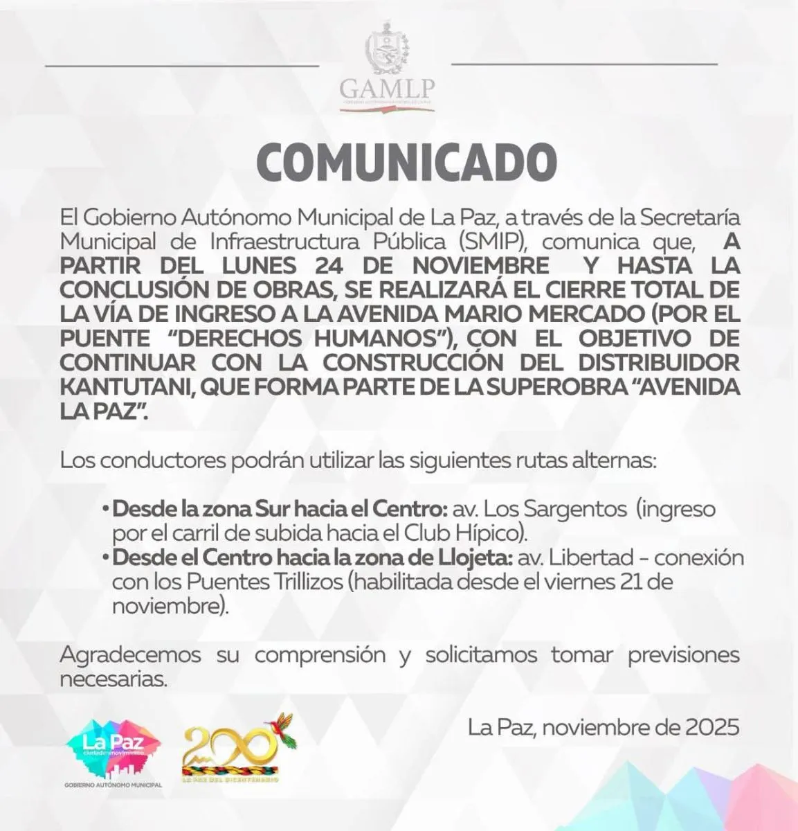 Agregó que el cierre responde a la necesidad de avanzar en la construcción del nuevo distribuidor, que articulará las avenidas Ormachea, Cerro de Obrajes y Kantutani, parte esencial del proyecto de la Avenida La Paz, que actualmente registra un 85% de avance.