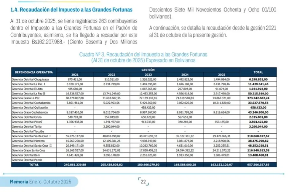 El Gobierno anunció este martes la eliminación del Impuesto a las Grandes Fortunas (IGF), tributo que recaudó, hasta el 31 de octubre pasado, 162 millones de bolivianos, a través de 263 contribuyentes registrados en el Servicio de Impuestos Nacionales.
