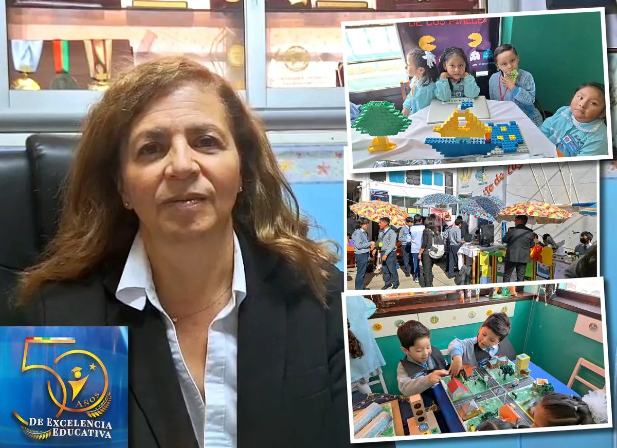 Costa, la directora de la unidad educativa y estudiantes con sus proyectos. Fotos y montaje: Visión 360