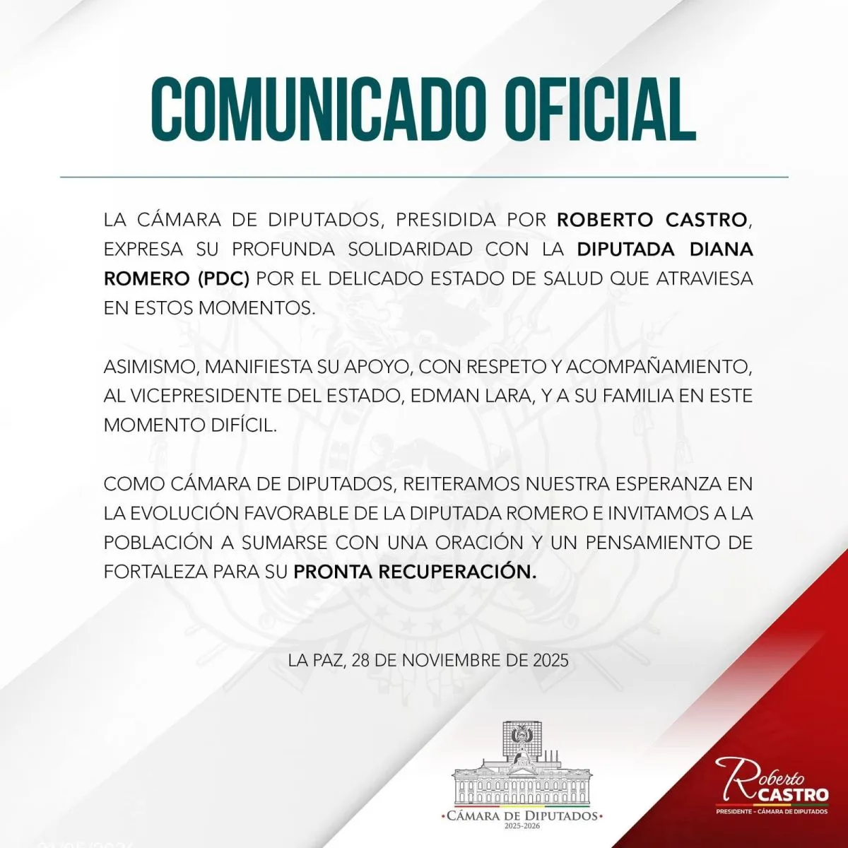 El empresario y jefe de la alianza Unidad también se pronunció a través de sus cuentas en redes sociales. “Expreso mi solidaridad para con la diputada Diana Romero, esposa del vicepresidente Edmand Lara. Le deseo que supere completamente los problemas de salud que está sufriendo en este momento y que pueda reintegrarse pronto a su familia y al trabajo parlamentario”, escribió.