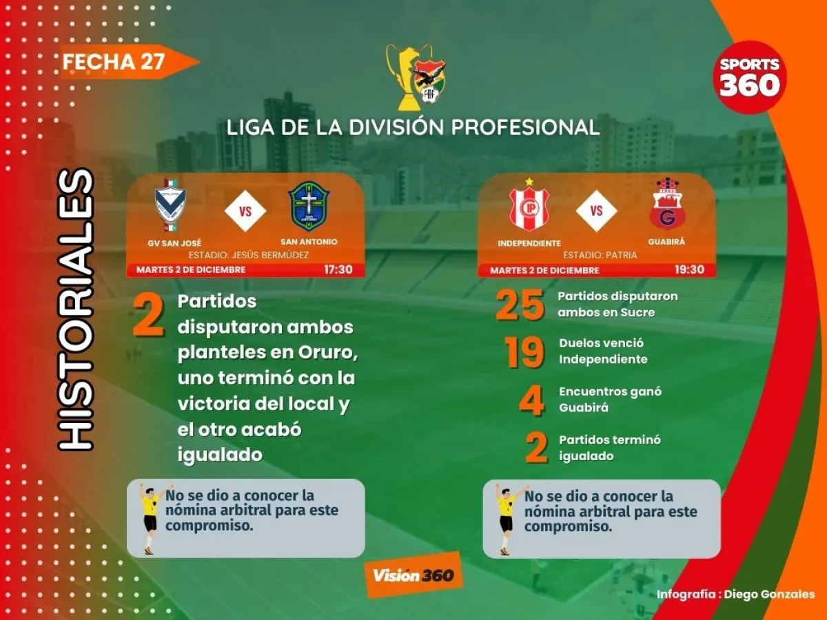 La vigesimoséptima jornada del torneo Liga de la División Profesional arrancará este martes con dos partidos entre rivales directos que luchan por asegurar un cupo internacional para 2026: GV San José vs. San Antonio Bulo Bulo e Independiente vs. Guabirá.