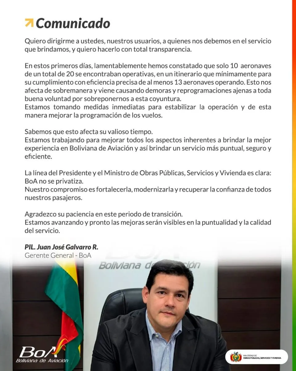 El gerente dice en el pronunciamiento que, en sus primeros días al frente de Boa, ha constatado que solo 10 aeronaves de un total de 20 se encontraban operativas, en un itinerario que, para su cumplimiento con eficiencia, precisa de al menos 13 aeronaves operando.