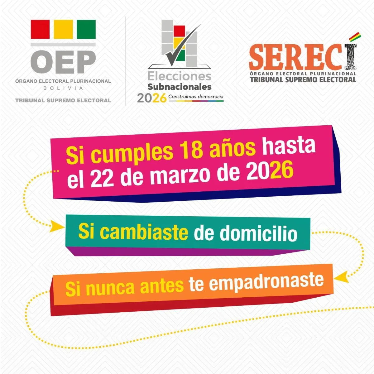 Este jueves 4 de diciembre comienza el empadronamiento masivo para las elecciones subnacionales, a cargo de los Servicios de Registro Cívico (Serecí) en los nueve departamentos del país, para los nuevos votantes que cumplirán 18 años hasta el 22 de marzo de 2026 y para los ciudadanos que cambiaron de domicilio.
