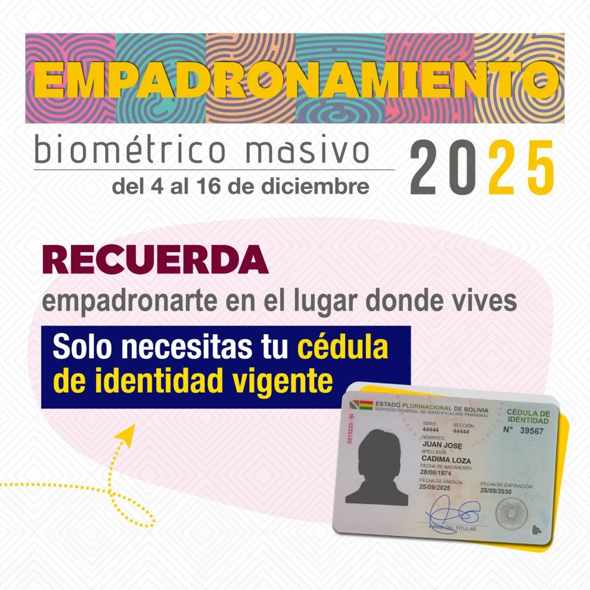 De acuerdo con el calendario electoral, el empadronamiento se desarrollará desde el 4 hasta el 16 de diciembre, ofreciendo a la ciudadanía 13 días continuos para realizar su registro. El único requisito para empadronarse es presentar la cédula de identidad original y vigente.