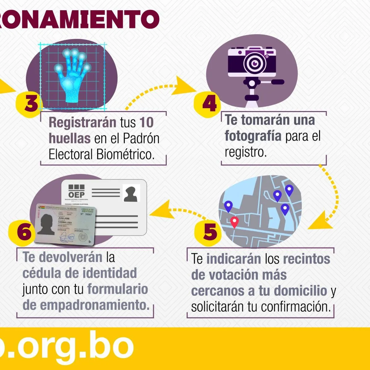 Según informa el Órgano Electoral, el empadronamiento biométrico es un registro presencial en el que se captura información biométrica (huellas dactilares, fotografía facial y firma digital), además de datos biográficos como nombres, apellidos, fecha y lugar de nacimiento, entre otros. También se registra el domicilio electoral, un dato esencial para asignar el recinto de votación correspondiente.