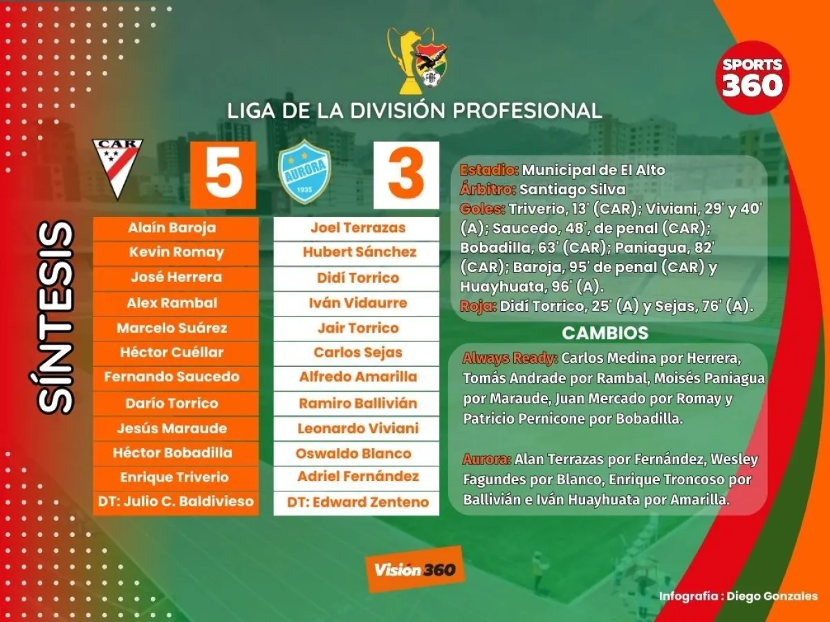 Always Ready, que sufrió en el primer tiempo, venció a Aurora (5-3), este jueves en el estadio Municipal de El Alto por la fecha 27 del torneo Liga de la División Profesional, y mete presión a The Strongest y Bolívar para que no fallen en sus respectivos partidos de día.