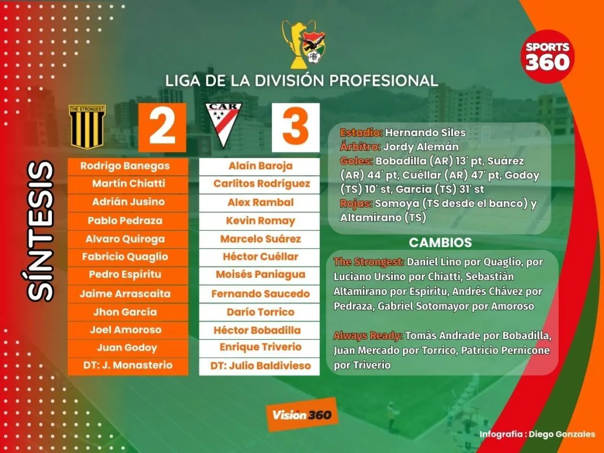 Always Ready esta en el umbral de conseguir la cuarta corona de su historia. El triunfo que consiguió esta noche frente a The Strongest (3-2) lo pone a un punto para llegar a su objetivo, que podría consolidarse el jueves cuando reciban en Villa Ingenio a Guabirá.