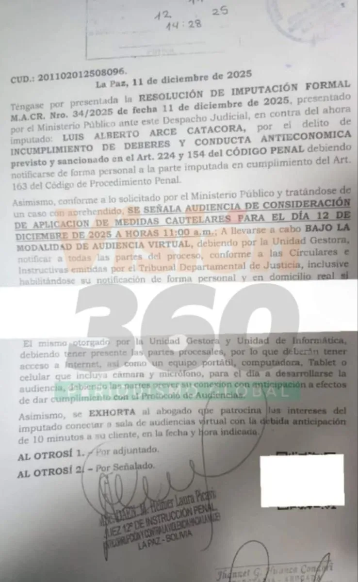 “Se señala audiencia de consideración de aplicación de medidas cautelares para el día 12 de diciembre de 2025 a horas 11.00; a llevarse a cabo bajo la modalidad de audiencia virtual, debiendo, por la unidad gestora, notificar a todas las partes del proceso, conforme a las circulares e instructivas emitidas por el Tribunal Departamental de Justicia”, señala la orden judicial, que lleva la firma del juez Helmer Laura, del Juzgado 12 Anticorrupción de La Paz.