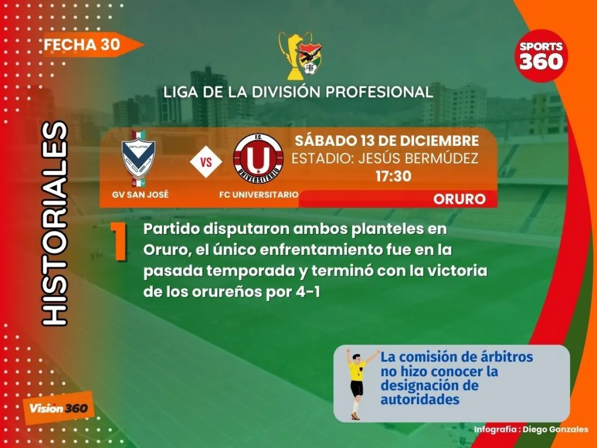 GV San José y Universitario de Vinto abren esta tarde la última fecha (30) del torneo todos contra todos en el estadio Jesús Bermúdez, en partido clave para el Santo que debe ir por el triunfo y esperar en la jornada del domingo un contraste de sus adversarios para ver si agarra un premio internacional.