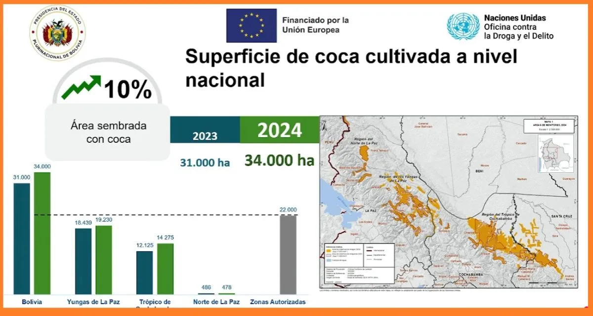 El más reciente informe de monitoreo de cultivos de la Unodc (Oficina de las Naciones Unidas contra la Droga y el Delito) registró un incremento del 10 % en los cultivos de coca en 2024. Ese reporte da cuenta de que en Bolivia existe una extensión de 34.000 hectáreas de cultivos de coca.