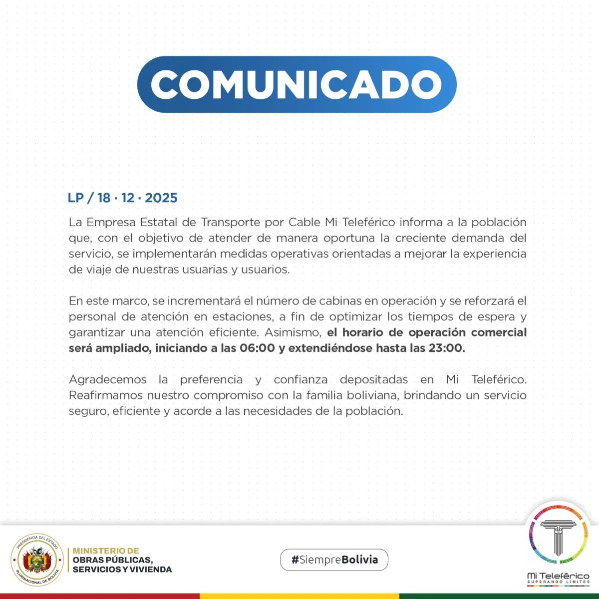 Debido a los conflictos sociales, en particular al bloqueo anunciado por los transportistas de La Paz, la empresa Mi Teleférico anunció que este viernes ampliará su servicio en todas sus estaciones. El nuevo horario será de 06.00 a 23.00.