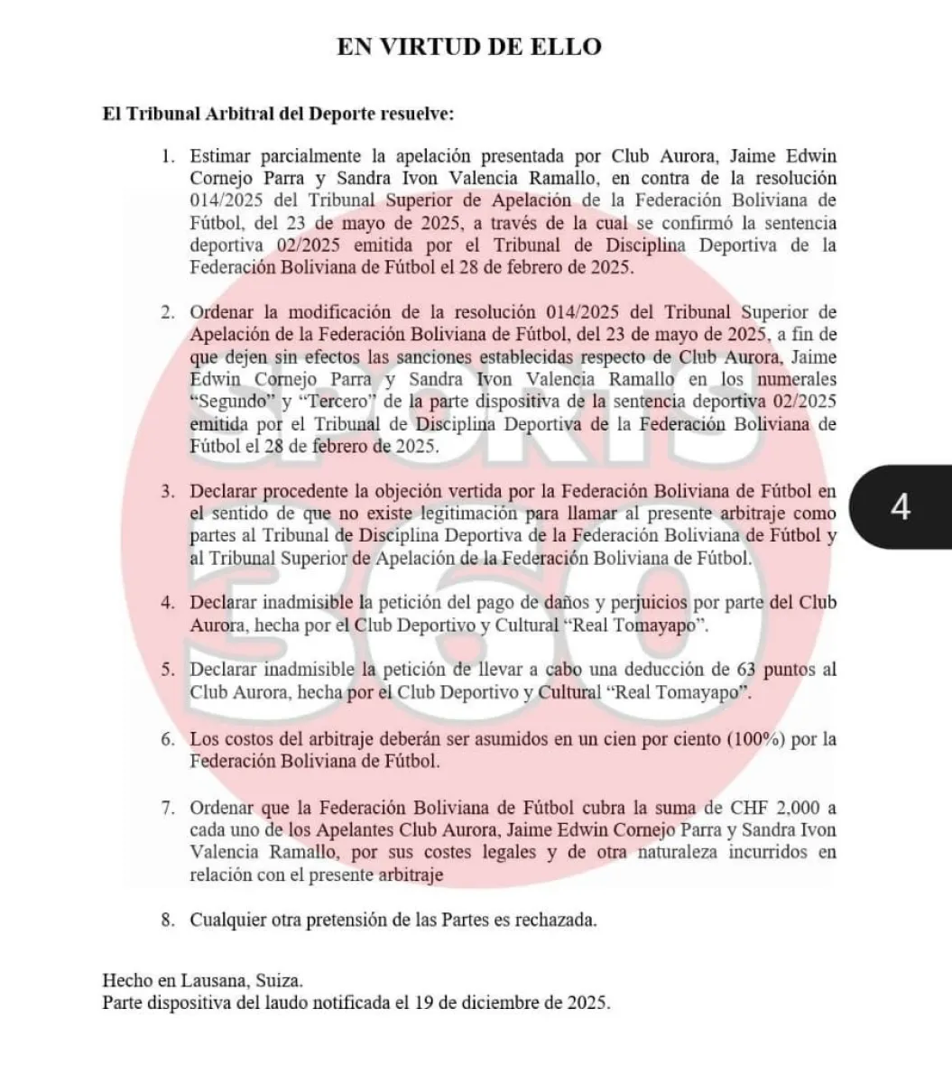 En la parte resolutiva que hizo público el TAS, de manera textual señala: Ordenar la modificación de la resolución 014/2025 del Tribunal Superior de Apelación de la Federación Boliviana de Fútbol, del 23 de mayo de 2025, a fin de que dejen sin efectos las sanciones establecidas respecto del Club Aurora, Jaime Edwin Cornejo Parra y Sandra Ivón Valencia Ramallo en los numerales “Segundo” y “Tercero” de la parte dispositiva de la sentencia deportiva 02/2025 emitida por el Tribunal de Disciplina Deportiva de la Federación Boliviana de Fútbol el 28 de febrero de 2025.