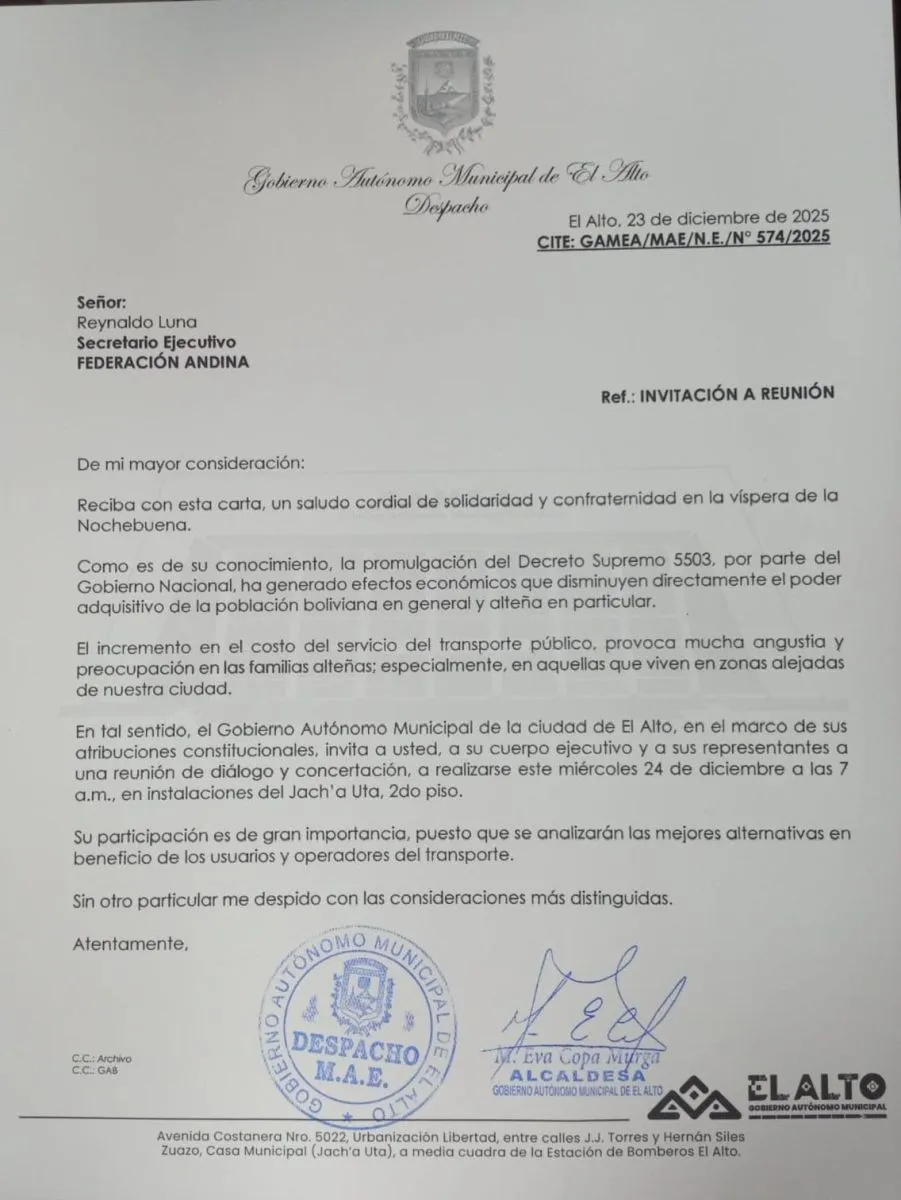 La alcaldesa de El Alto, Eva Copa, convocó este martes al secretario ejecutivo de la Federación Andina de Choferes de El Alto, Reynaldo Luna, a una reunión para analizar el incremento de los pasajes en la urbe y evaluar los efectos del Decreto Supremo 5503 en la economía de las familias alteñas y en el servicio de transporte público, informó la comuna.