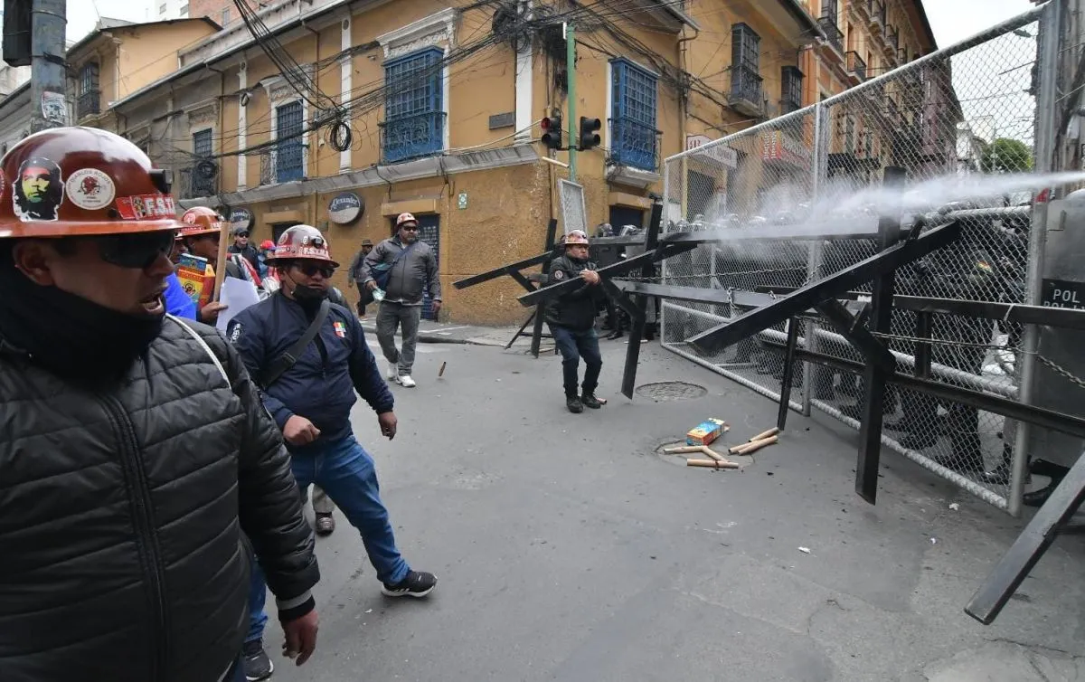Los mineros de la COB intentaron cruzar una valla de seguridad instalada en la esquina de las calles Mercado y Ayacucho, en las puertas de la Vicepresidencia, donde forcejearon contra los policías, que respondieron con agentes químicos.