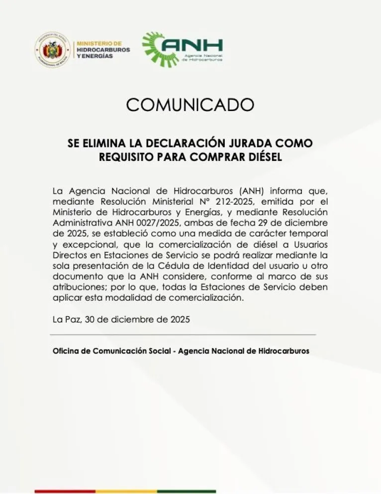 "Mediante Resolución Ministerial N° 212-2025, emitida por el Ministerio de Hidrocarburos y Energías, y mediante Resolución Administrativa ANH 0027/2025, ambas de fecha 29 de diciembre de 2025, se estableció como una medida de carácter temporal y excepcional que la comercialización de diésel a Usuarios Directos en Estaciones de Servicio se podrá realizar mediante la sola presentación de la Cédula de Identidad del usuario u otro documento que la ANH considere, conforme al marco de sus atribuciones”, indicó la ANH mediante un comunicado de prensa.