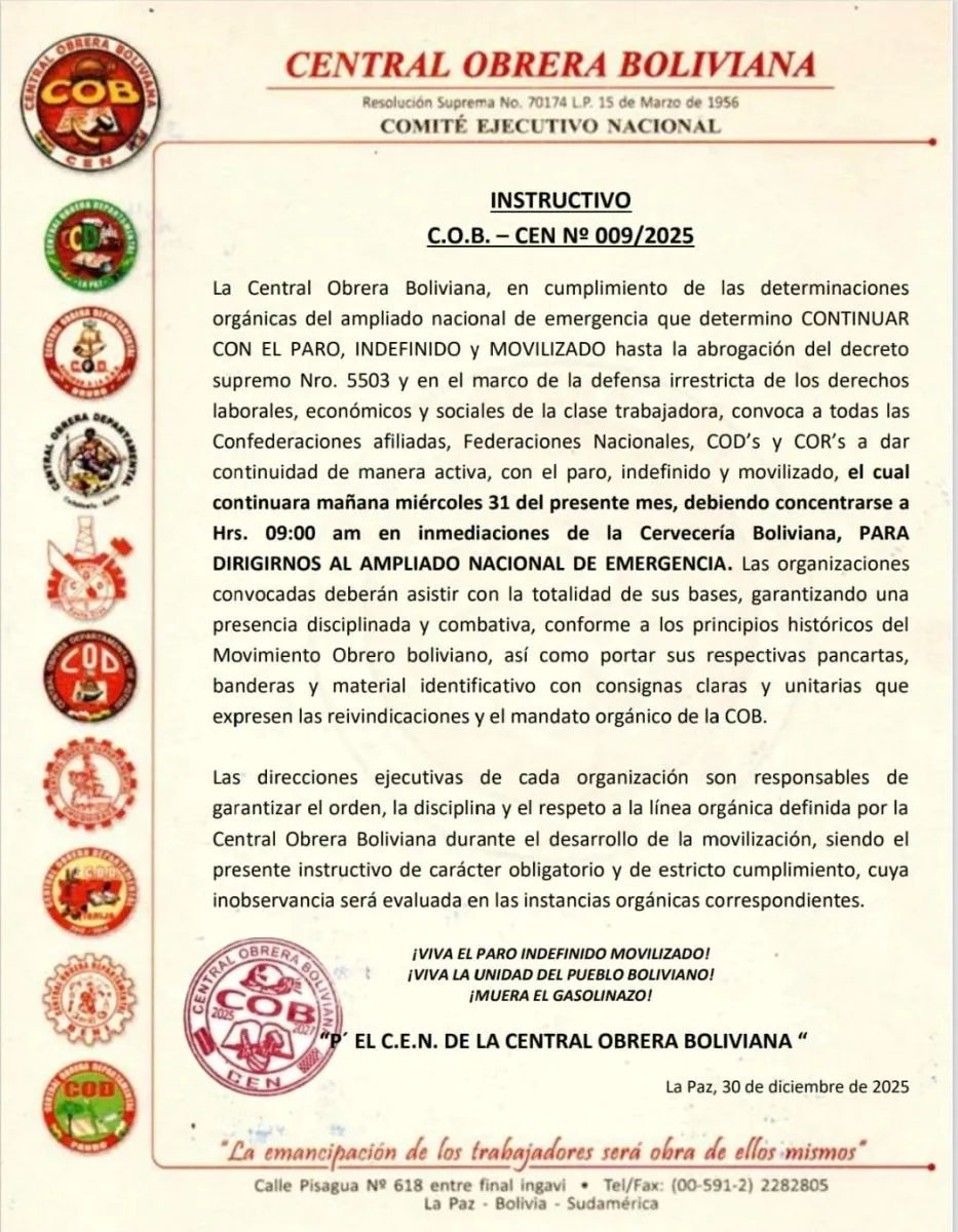 Mediante un instructivo, al que tuvo acceso Visión 360, la entidad matriz afirma que el miércoles 31 de diciembre continuarán las medidas de protesta, “debiendo concentrarse a las 9:00 de la mañana en inmediaciones de la Cervecería Boliviana Nacional, para dirigirnos al ampliado nacional de emergencia”.