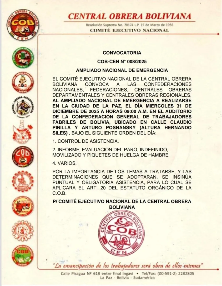 “Las organizaciones convocadas deberán asistir con la totalidad de sus bases, garantizando una presencia disciplinada y combativa, conforme a los principios históricos del movimiento obrero boliviano, así como portar sus respectivas pancartas, banderas y material identificativo, con consignas claras y unitarias que expresen las reivindicaciones y el mandato orgánico de la COB”, indica el instructivo.