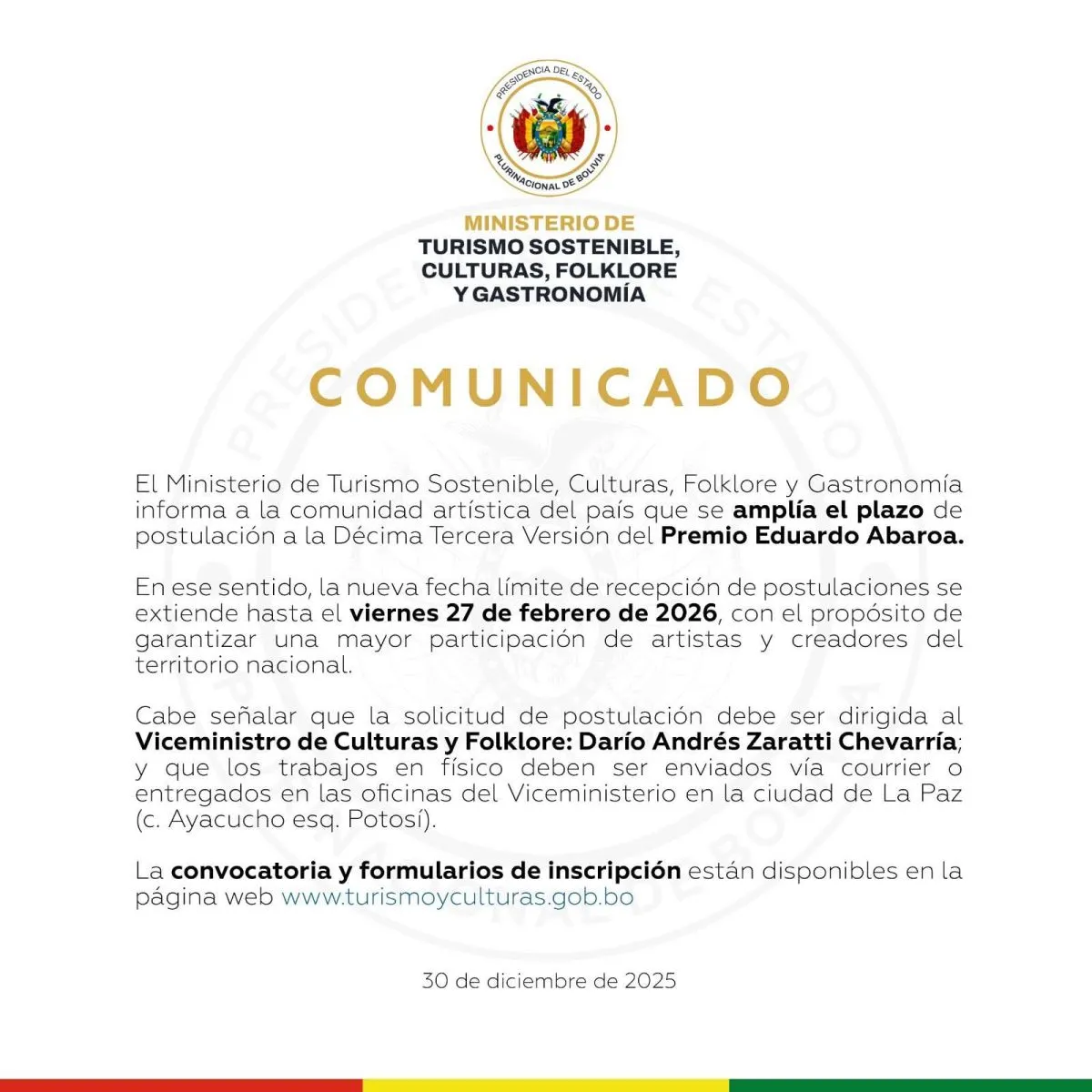 Los artistas tienen hasta el viernes 27 de febrero para presentar sus postulaciones a la 13 edición de los Premios Plurinacionales Eduardo Abaroa 2026, que este año reúne seis categorías y 31 especialidades. Los trabajos deberán ser enviados en soporte físico a las oficinas del Viceministerio de Culturas y Folklore, en La Paz.