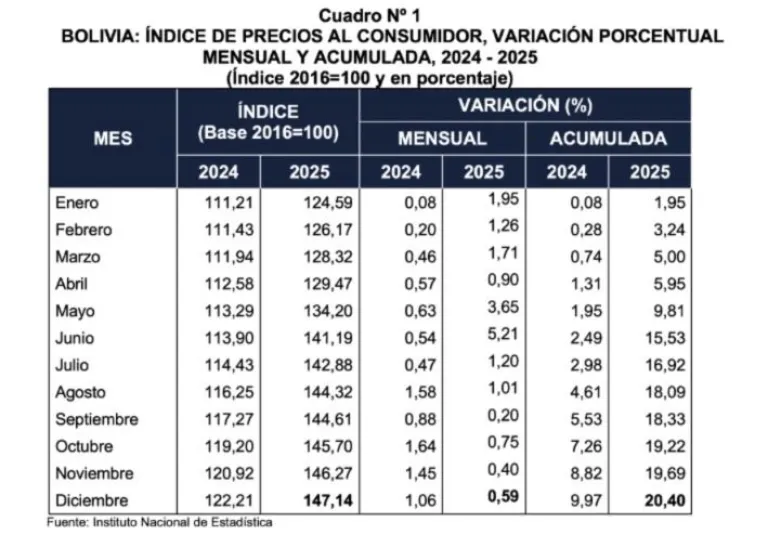 El Ministerio de Planificación del Desarrollo y Medio Ambiente informó este martes que la variación del Índice de Precios al Consumidor (IPC), registrada en el mes de diciembre, fue de 0,59 %, lo cual muestra una estabilidad en los precios del mercado. La inflación acumulada en doce meses alcanza el 20,40 %.