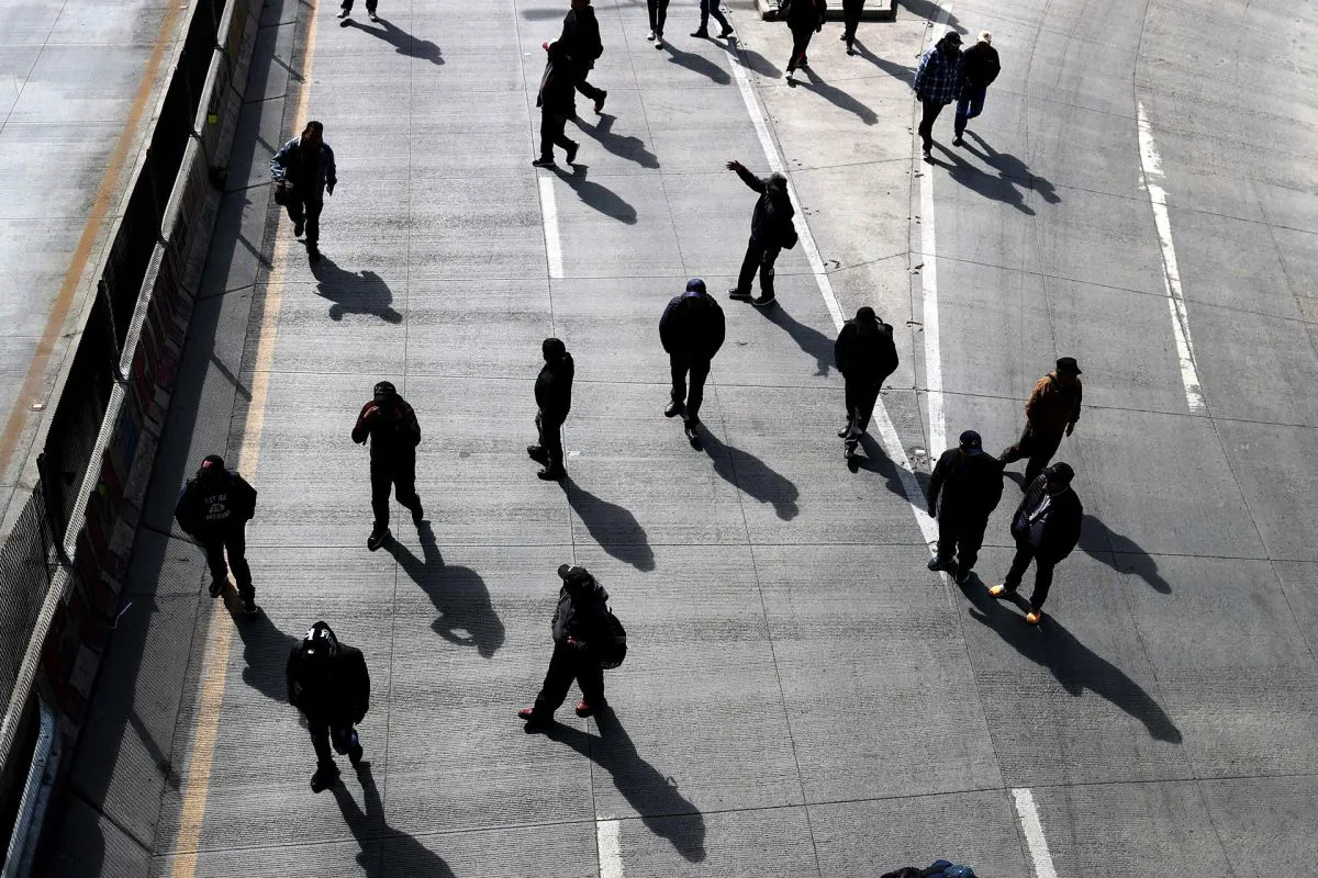 Personas caminan por una calle bloqueada por integrantes de la Central Obrera Boliviana (COB) este jueves, en La Paz. Foto: EFE
