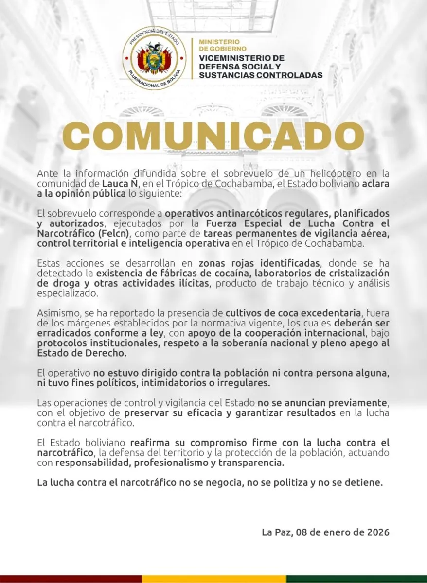 "El sobrevuelo corresponde a operativos antinarcóticos regulares, planificados y autorizados, ejecutados por la Fuerza Especial de Lucha Contra el Narcotráfico (Felcn), como parte de tareas permanentes de vigilancia aérea, control territorial e inteligencia operativa en el Trópico de Cochabamba", indica el mensaje. "El operativo no estuvo dirigido contra la población ni contra persona alguna, ni tuvo fines políticos, intimidatorios o irregulares", continúa.