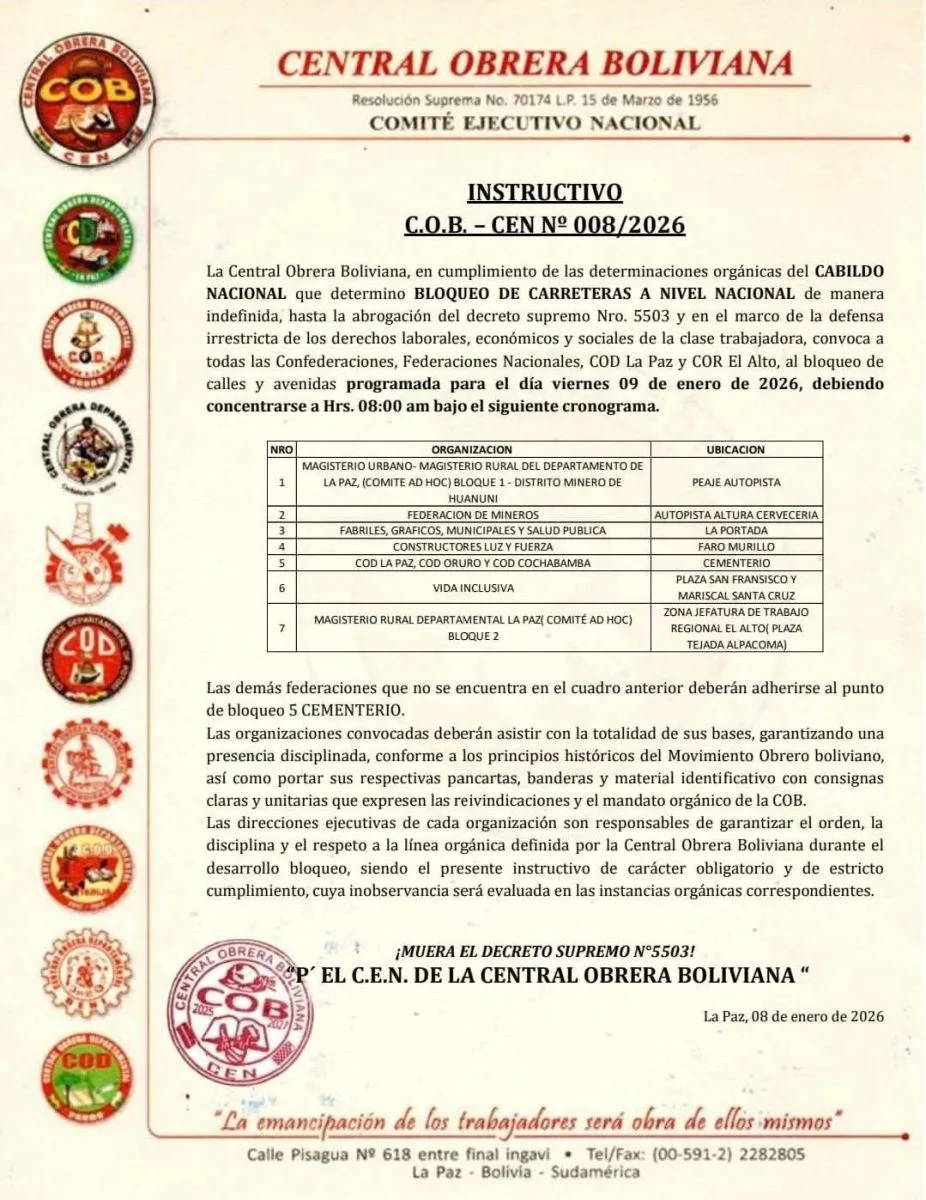 En las mismas cuentas de la COB se publicó el instructivo para el bloqueo de calles y carreteras, que ya suman 36 en todo el país, para este viernes 9 de enero.