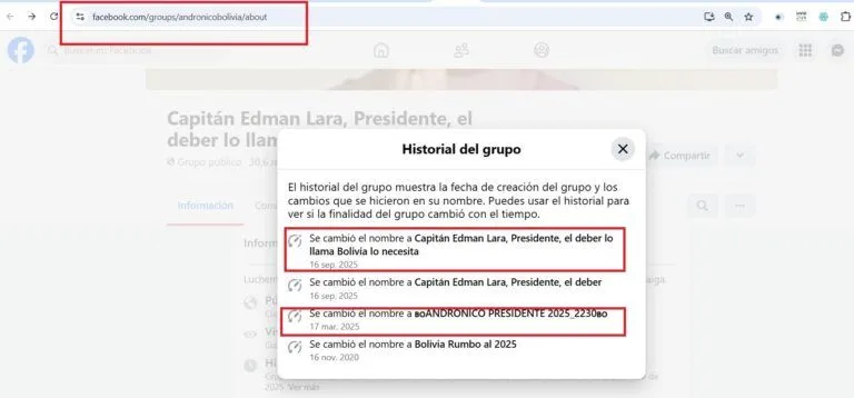 Al menos siete cuentas y grupos en Facebook que difundían contenidos a favor del MAS, Evo Morales y Andrónico Rodríguez —varios identificados por Bolivia Verifica como desinformantes— modificaron sus nombres, líneas editoriales y narrativas para promover a Edman Lara y atacar a Rodrigo Paz. El monitoreo detectó patrones coordinados, reutilización de contenidos y amplificación de discursos polarizantes.