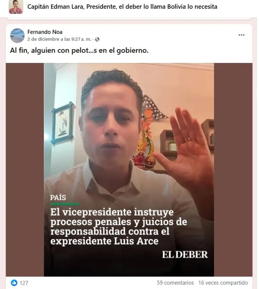 En la misma línea opera otro grupo también denominado Capitán Edman Lara, el deber lo llama Bolivia lo necesita, que replica publicaciones del primero.