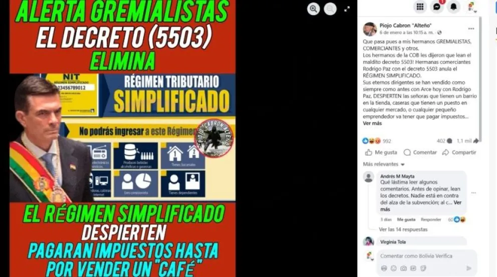 Desde El Piojo Cabrón «Alteño» compartieron contenidos falsos sobre los alcances del decreto, asegurando que la norma elimina el régimen simplificado y obliga a los gremialistas «a pagar impuestos hasta por vender un café».