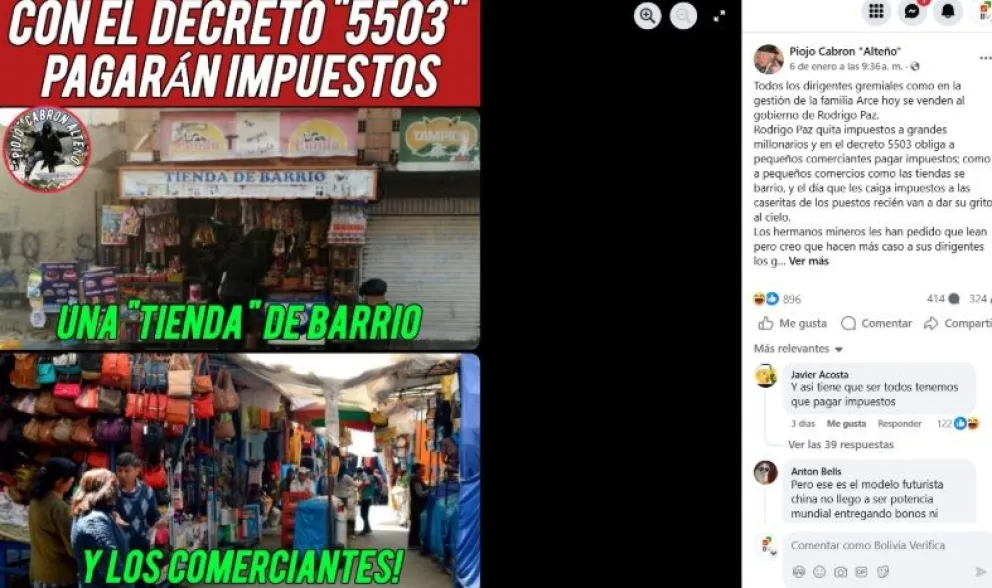 Incluso publicaron contenidos falsos en sentido de que el máximo dirigente cobista, Mario Argollo y otros ejecutivos que lideran la protesta contra la normativa, fueron detenidos, lo cual fue desmentido por Bolivia Verifica.