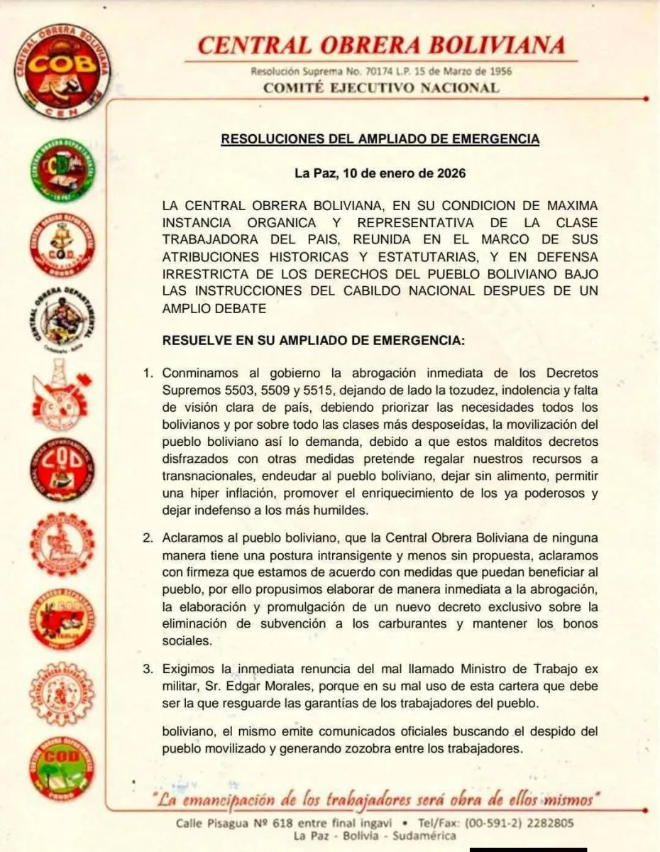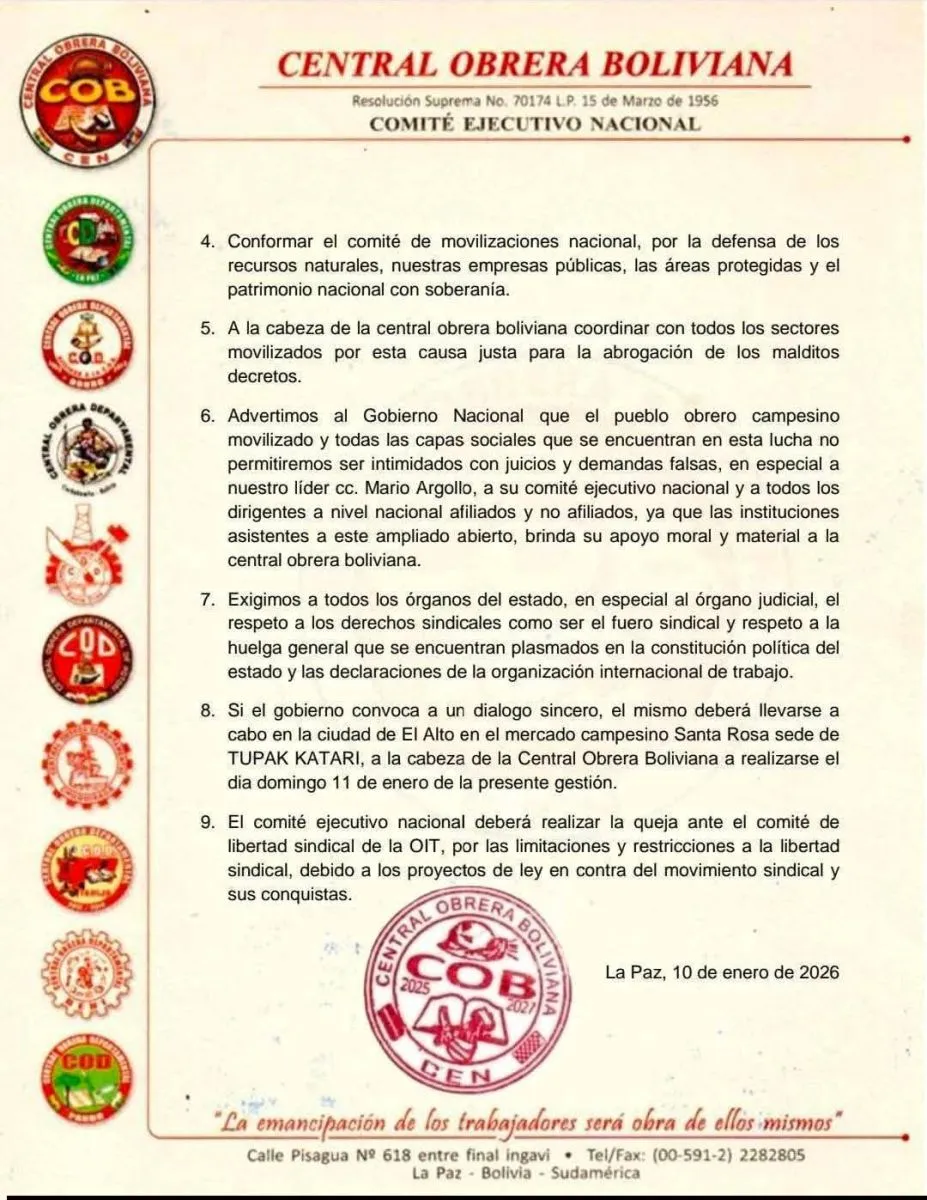 En un ampliado de emergencia realizado la noche de este sábado 10 de enero, la Central Obrera Boliviana (COB) determinó plantear nuevas demandas al Gobierno y, además, condicionó un eventual diálogo a que se realice en la ciudad de El Alto. De lo contrario, amenazó con radicalizar sus protestas, que durante la jornada se expresaron en 57 puntos de bloqueo dispersos en distintas carreteras de todo el país.
