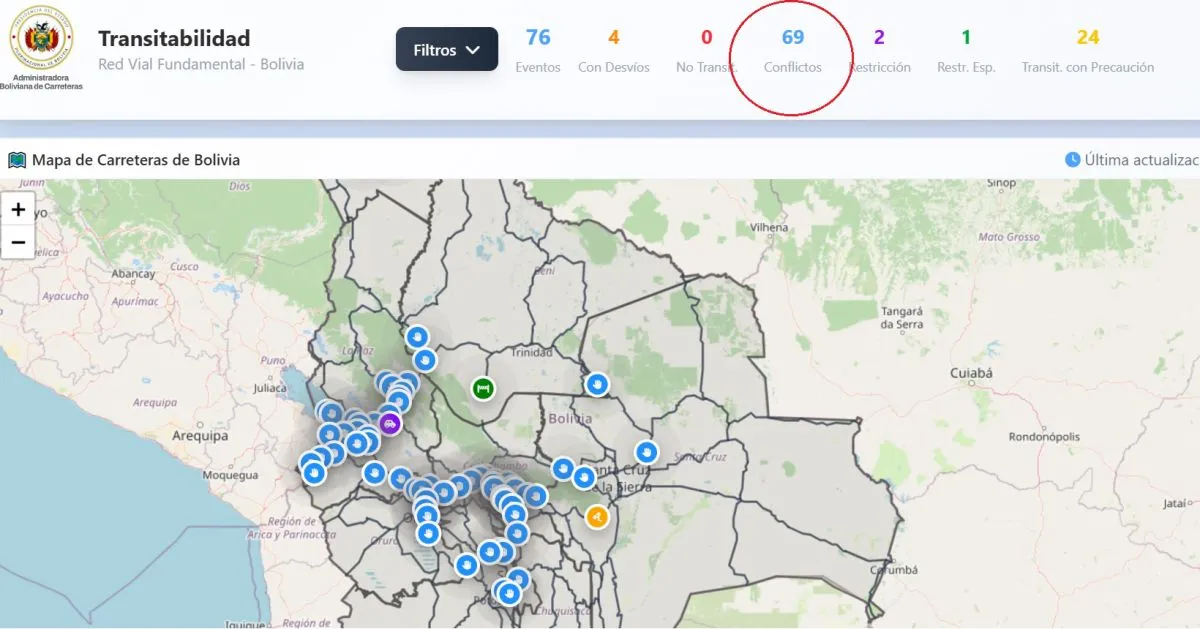 Ayer, la jornada había comenzado con 57 puntos de bloqueo reportados por la Administradora Boliviana de Carreteras. A las 08.00 de este domingo, la cantidad de puntos carreteros interrumpidos por las protestas sociales subió a 69, la mayor parte de ellos ubicados en La Paz y Cochabamba.