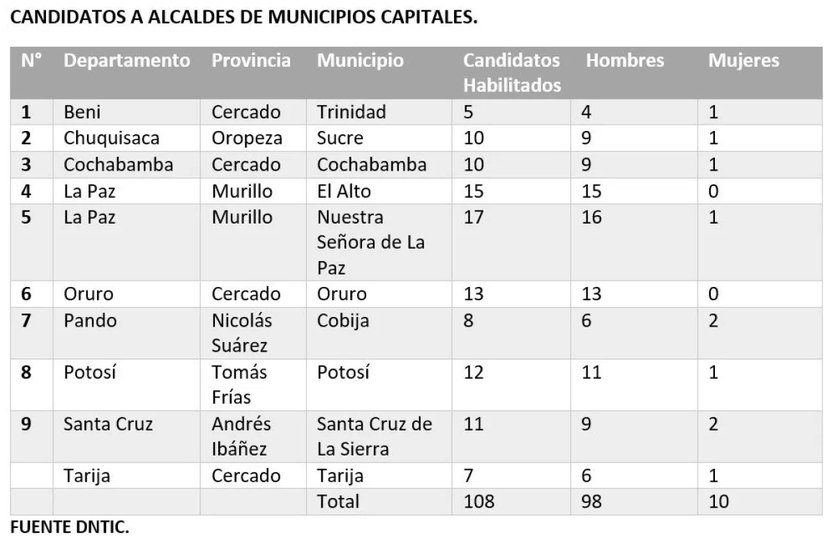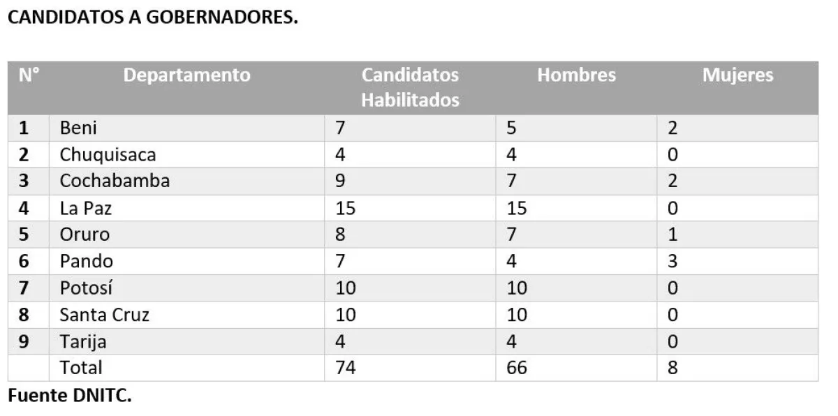 El Tribunal Supremo Electoral (TSE) informó que, tras la conclusión de la etapa de revisión y verificación de requisitos, se habilitaron 74 candidaturas para las gobernaciones y 108 para las alcaldías de municipios capitales, a nivel nacional.