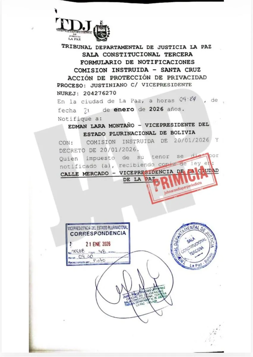 La notificación fue enviada a Lara a través de Correspondencia de la Vicepresidencia, de acuerdo al sello de recepción que aparece en el documento de notificación publicado por el periodista John Arandia en su muro de Facebook.